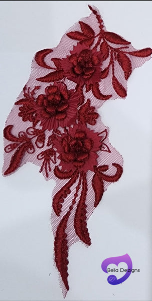 BURGUNDY - Lace Applique Motif - 3D 3 Flower Feather Tail $3.50