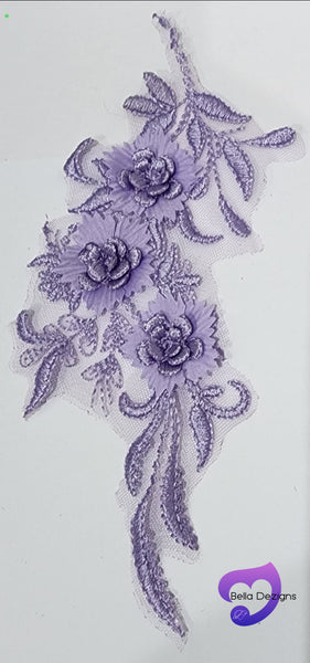 PURPLE - Lace Applique Motif - 3D 3 Flower Feather Tail $3.50
