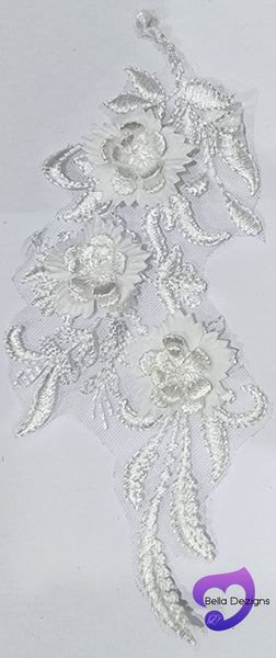 WHITE - Lace Applique Motif - 3D 3 Flower Feather Tail $4.50